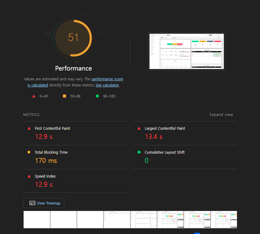 LCP(Largest Contentful Paint)는 13.4s .. 매우 높은 수치 입니다.