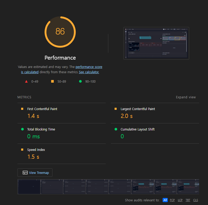 위의 사진에서 제일 먼저 보이다시피 FCP(First Contentful Paint) 는 1.4s,